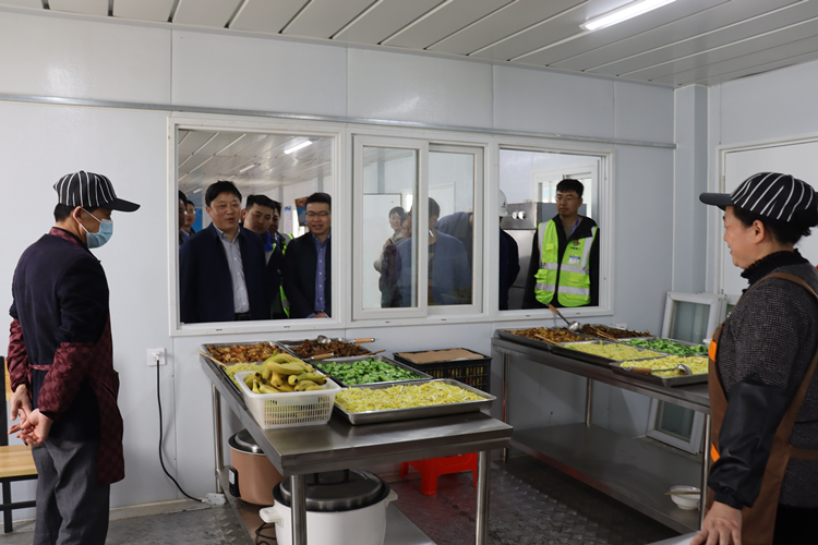 調研中,何洪春一行深入施工現場、員工宿舍和員工食堂,實地察看了施工進度,與員工親切交談,了解員工工作及后勤保障情況。在施工現場何洪春要求,一定要關愛一線員工的生活,努力創造好的生活環境,做好后勤保障工作,為施工生產有效推進奠定堅實的基礎保障。