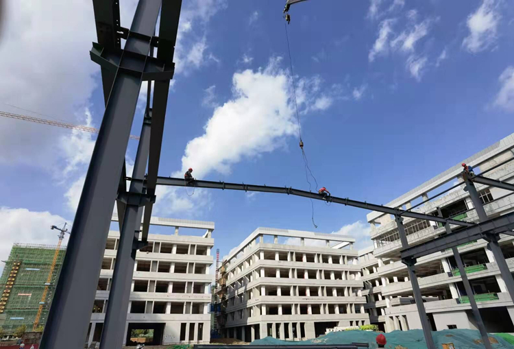 八公司臨廬欣榮農民返鄉創新創業基地建設項目照常施工,圖為7#、8#樓鋼結構安裝