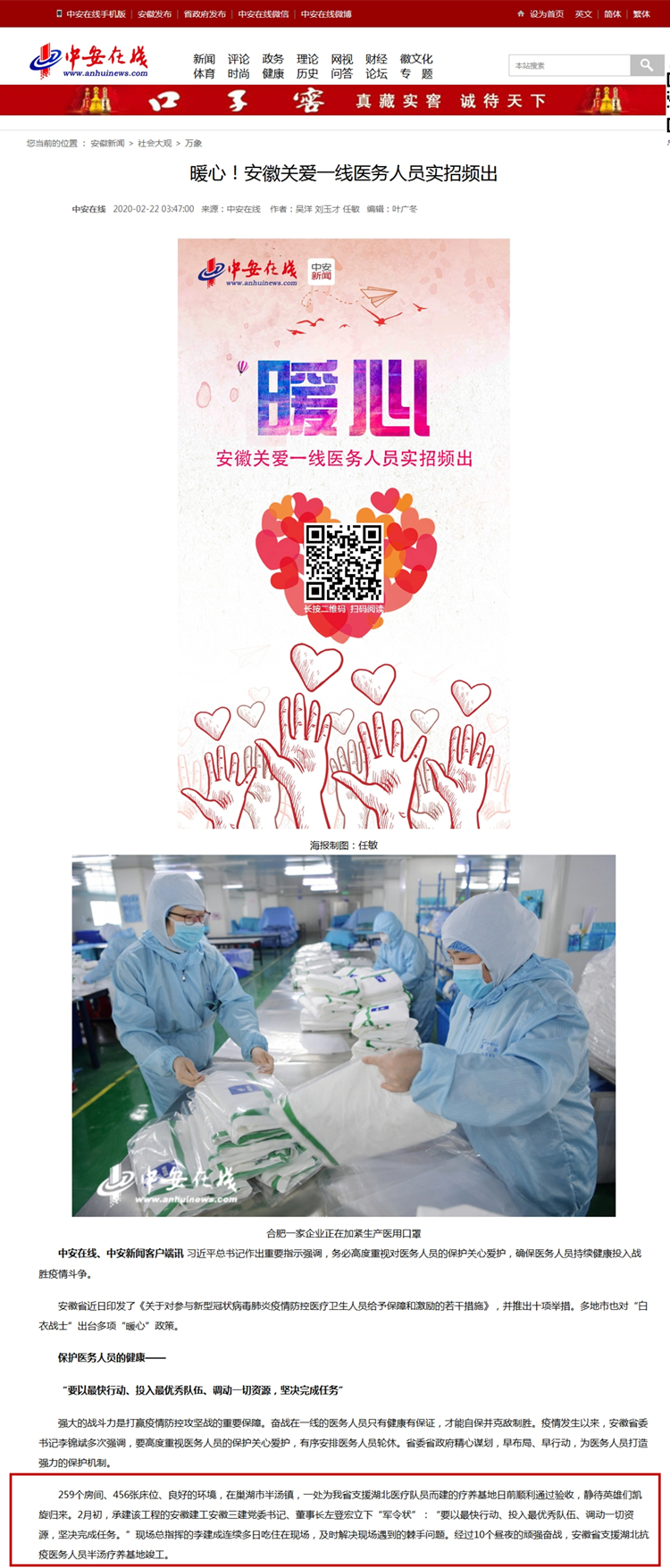 中安在線、央廣網、中新網、國際在線——暖心!安徽關愛一線醫務人員實招頻出 發布時間:2020-02-26 來源:中安在線、央廣網、中新網、國際在線 撰稿人: 瀏覽次數:16048 網址鏈接: 中安在線:http://ah.anhuinews.com/system/2020/02/22/008352394.shtml 央廣網:http://news.cnr.cn/native/gd/20200222/t20200222_524987284.shtml 中新網:http://www.chinanews.com/sh/2020/02-22/9101239.shtml 國際在線: http://news.cri.cn/20200222/6faa4074-5d1b-ef06-5944-b8a7ca8d5931.html