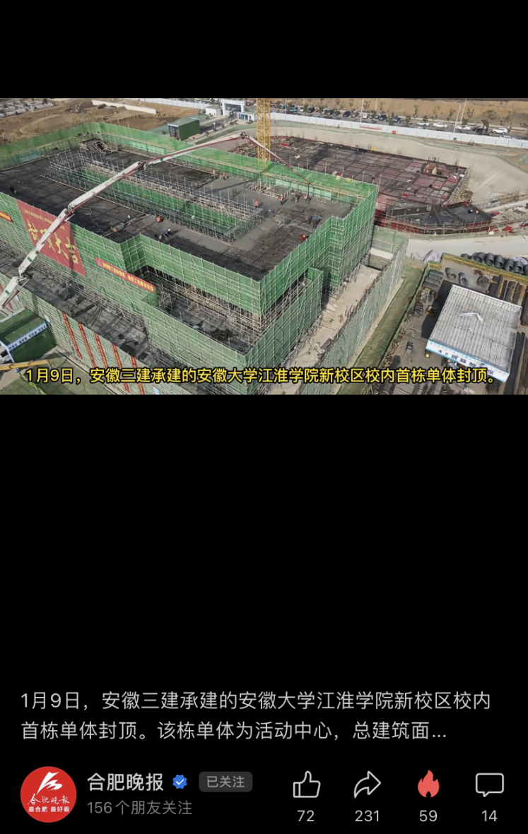 媒體聚焦丨合肥晚報視頻號、江淮晨報報道公司承建的安徽大學江淮學院新校區(qū)項目最新進展