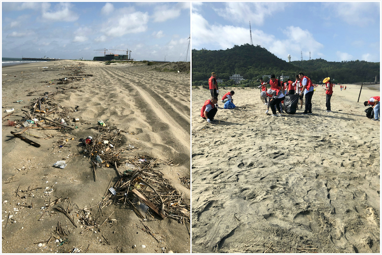 圖為海灘原貌與志愿者清理后的對比圖