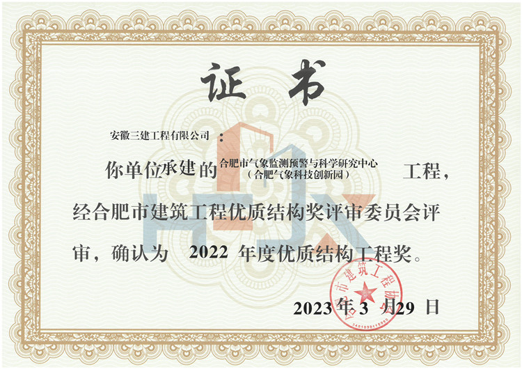 合肥市氣象監測預警與科學研究中心項目榮獲2022年度合肥市“優質結構工程”稱號