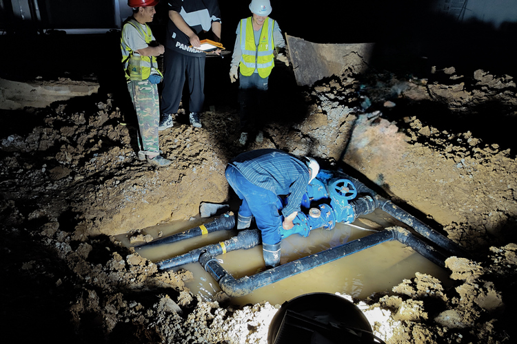 一天晚上,正值項目室外給水及消防新老管網接駁,為了確保工程萬無一失,建工三建優秀共產黨員、安裝項目經理曾小均同志充分發揮黨員先鋒模范帶頭作用,與施工員高峰同志一起下到泥濘不堪的水坑中安裝閥門。由于夜間作業面的能見度受到限制,于是,技術員孫維康同志便舉著燈,同技術負責楊濤同志一起摸排接駁的管道是否存在漏水點。雖然工作很辛苦,但是看到大家都在為了達成同一個目標而共同拼搏的場景,每一個安裝管理人員又都充滿干勁,就像曾小均說的那樣:“這是安裝人應有的使命與擔當!是建工三建一脈相承的鐵軍精神和不辱使命鐵肩擔當。”