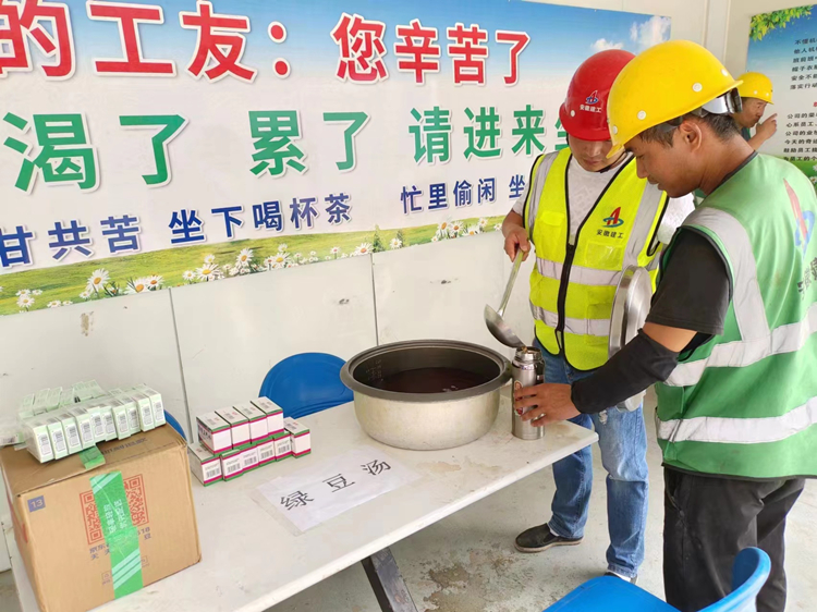 所有的安全活動是為了更好的,更放心的生產,實現安全和發展的良性循環。進入6月后,天氣逐漸炎熱,多日持續高溫,項目上為了確保工人施工安全,每日免費提供藿香正氣水、仁丹和綠豆湯,并安排專人巡查,有因高溫不適的工人,及時通知休息,確保安全高效的生產。