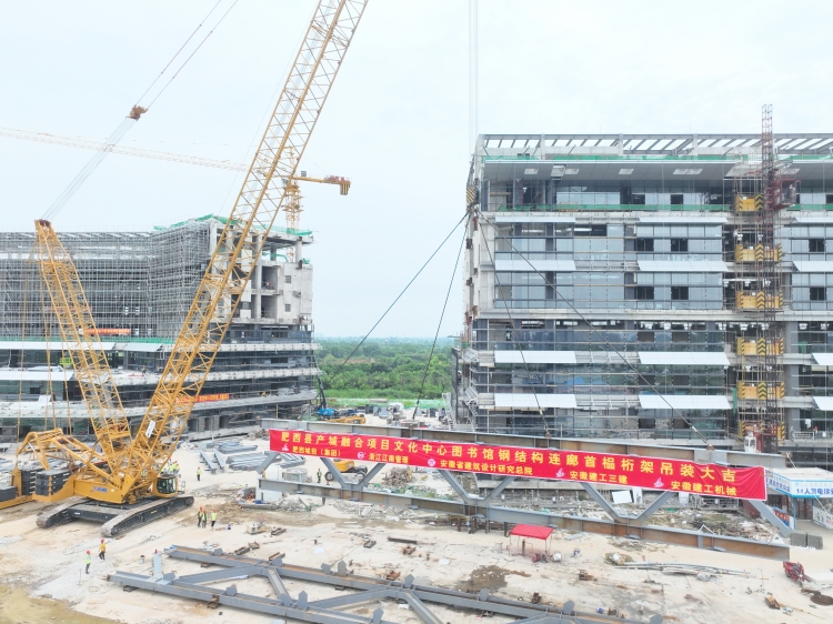 7月13日上午,肥西縣產城融合項目文化中心圖書館鋼結構連廊首榀桁架吊裝成功,標志項目建設取得階段性進展。