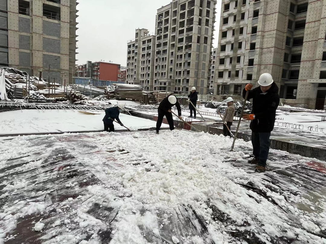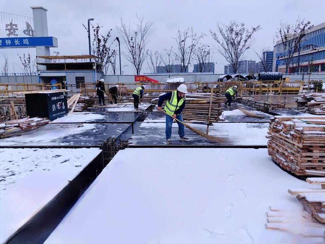 蜀山經濟產業園建設項目現場,為保障項目的施工進度和現場的施工安全,全體管理人員都參與到清掃施工板面積雪的活動中。