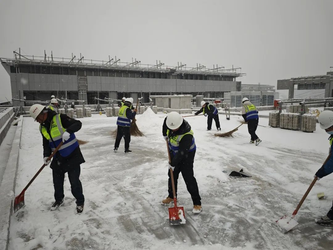 中科院臨床研究醫院項目施工現場被積雪覆蓋,為確保項目生產正常進行,及時消除安全隱患,項目職工自發行動,拿起掃把、鐵鍬清掃積雪。