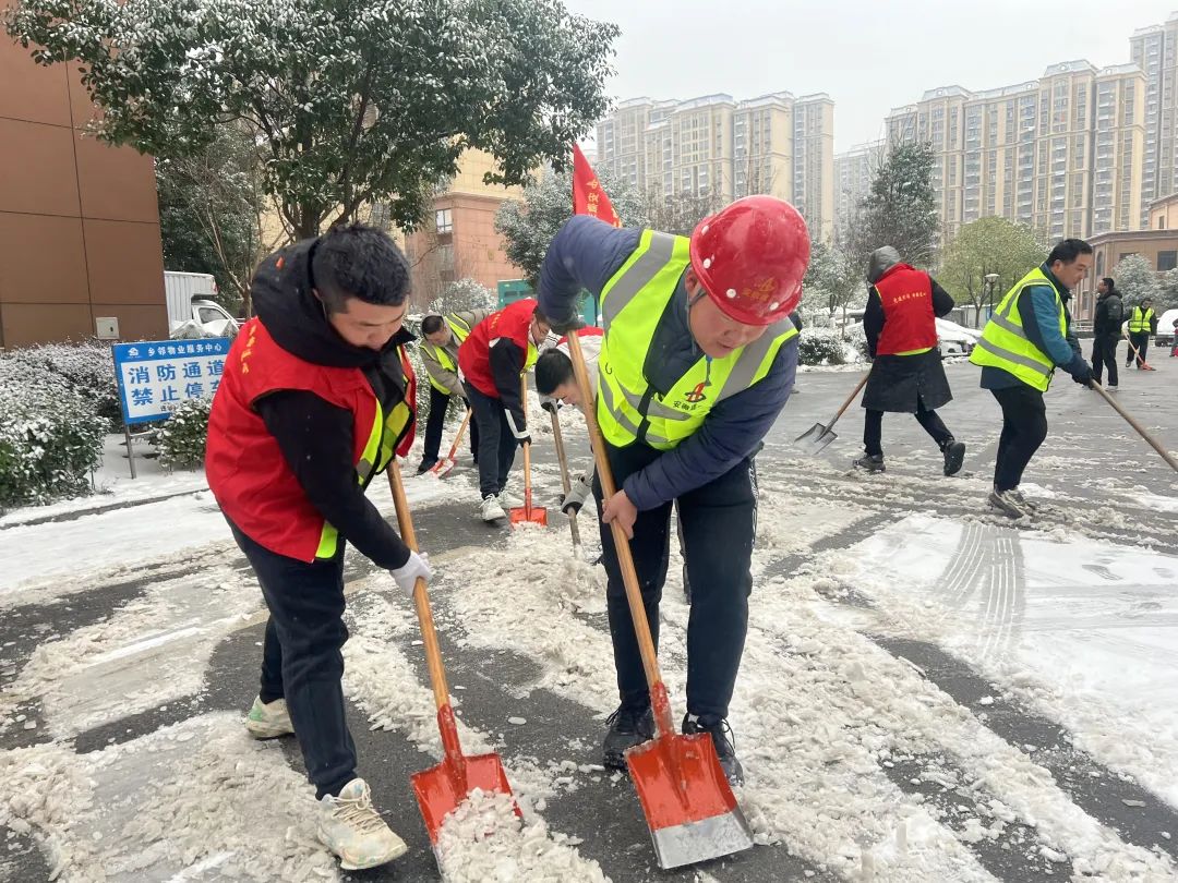 潭沖河家園項目組織黨員及40余名管理人員不畏嚴寒,迅速行動,清理項目周邊積雪,確保周邊道路通暢。