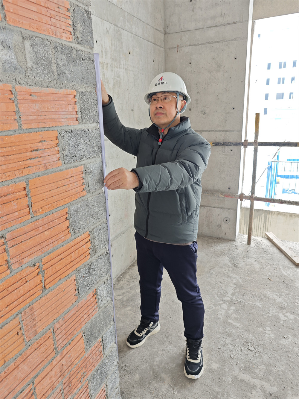 “項目全體職工加班加點奮斗在一線,保進度保質量,就是為了給業主們一個滿意的答復。”技術負責虞玉東正在檢查煤矸石砌體馬牙槎的尺寸及砌體磚縫厚度。
