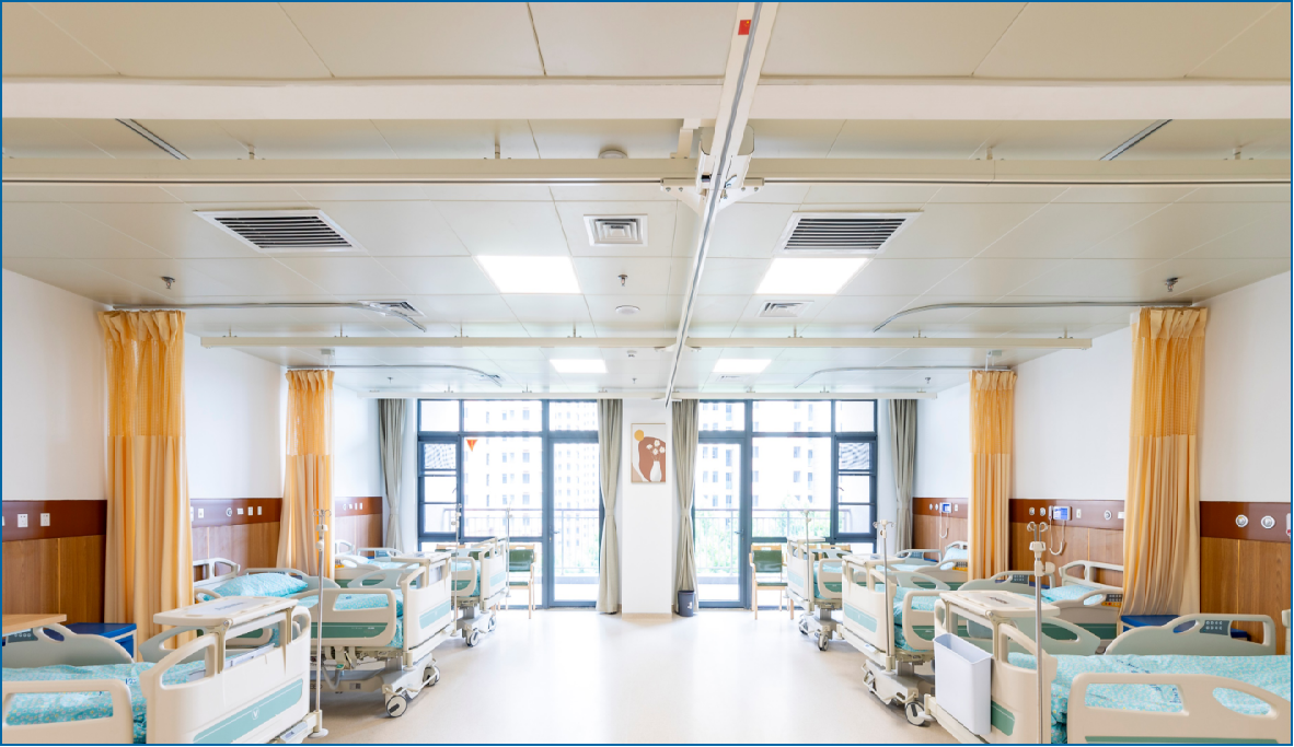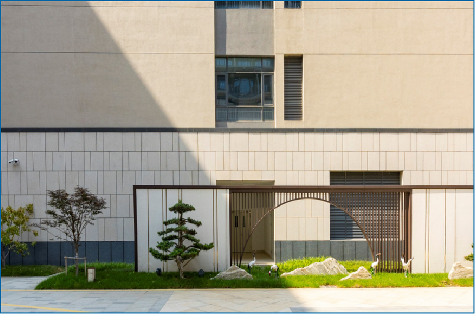 設(shè)計(jì)上,摒棄了傳統(tǒng)醫(yī)院病房樓的直通式走廊,形成類似“街道+廣場(chǎng)”的空間,成為充滿生活氛圍的社區(qū)交往空間,延續(xù)家居感覺(jué)。根據(jù)不同使用人群(失能、失智老年人、自理老人)的需求,設(shè)置不同的配套服務(wù)功能,以康養(yǎng)軸連接南、北、中部各功能模塊,利用無(wú)障礙人行通道形成風(fēng)雨無(wú)阻的步行系統(tǒng)。設(shè)置智能適老化看護(hù)管理系統(tǒng)和無(wú)障礙智能載人天軌系統(tǒng),施工策劃全面考慮運(yùn)營(yíng)需求,確保系統(tǒng)平穩(wěn)運(yùn)行且無(wú)交叉、無(wú)干擾。