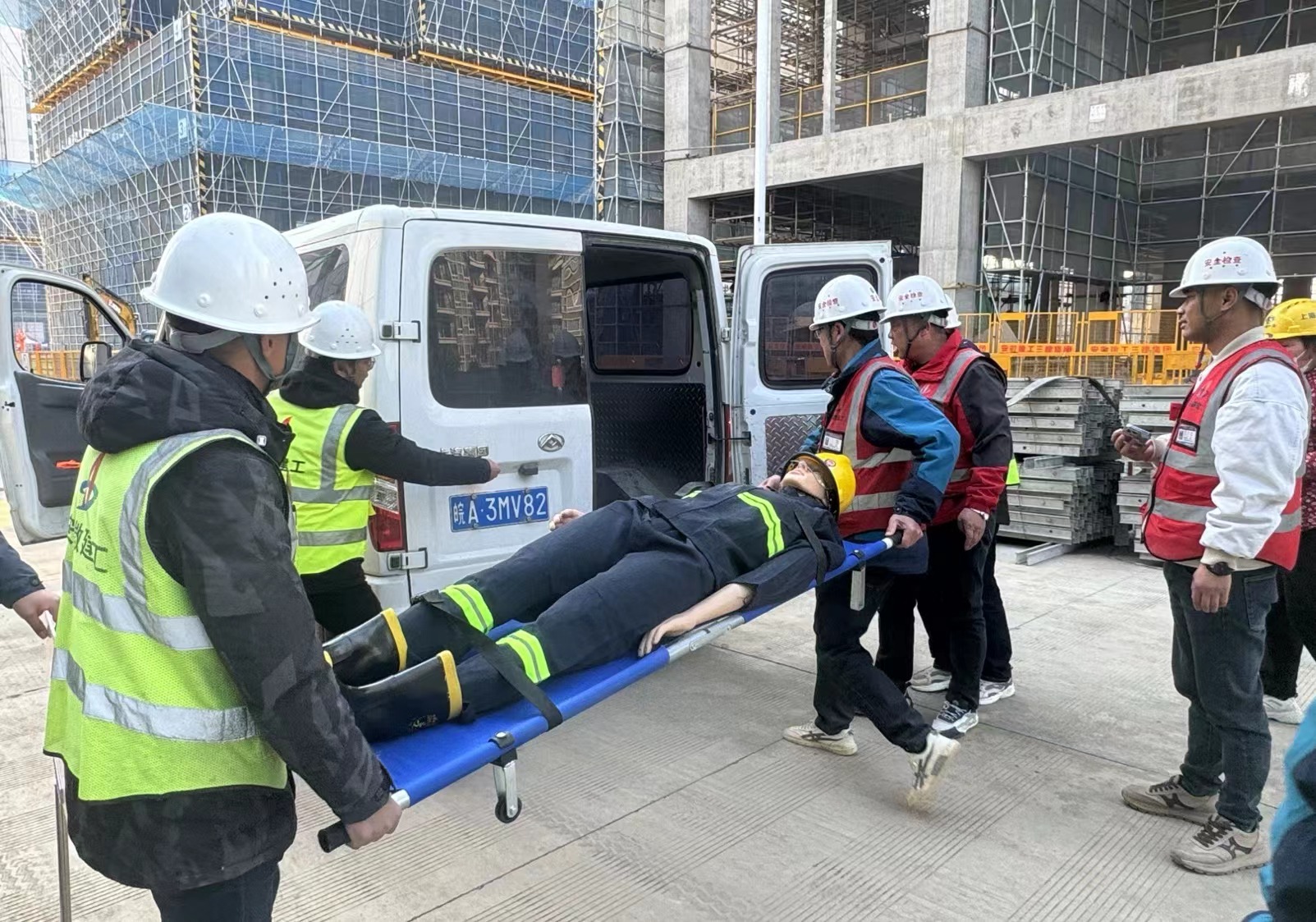 演練前,現場人員被分為警戒組、疏散組、救援組,在了解演練流程與安全事項后,演練正式開始,警戒組迅速行動,分工明確,快速在事故周邊拉起警戒線,設置警示標識,禁止無關人員靠近,為救援現場營造安全區域;同時,救援組攜帶擔架、急救箱等專業設備進入事發現場,熟練檢查“傷者”傷勢并進行急救,隨后將“傷者”平穩送上救護車。整場演練,各小組分工明確、協同配合,以最短的時間高效地完成了本次演練任務,充分展現了團隊協作的高效性,有效檢驗了應急預案的可行性,提升了管理人員的應急處置能力,更讓全體人員深刻認識到嚴抓施工安全管理的重要性。