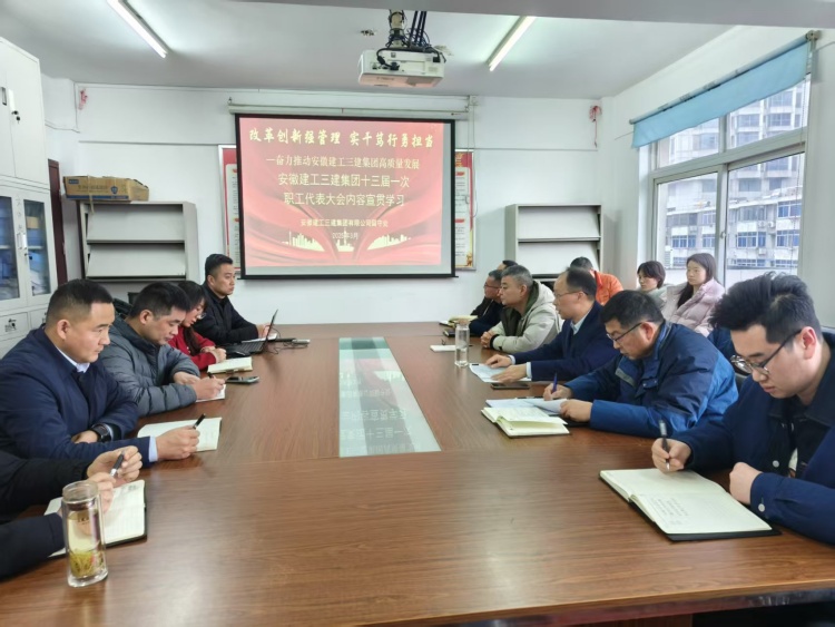 近日,安徽建工集團控股有限公司三屆二次職工代表大會暨2025年工作會議和安徽建工三建集團有限公司十三屆一次職代會暨2025年工作會議勝利召開。會后,建工三建所屬各單位迅速掀起學習宣貫熱潮,確保兩級職代會精神傳達到每一位職工,進一步統一思想、凝心聚力,推動公司高質量發展,為集團轉型發展、高質量發展、大發展貢獻力量。