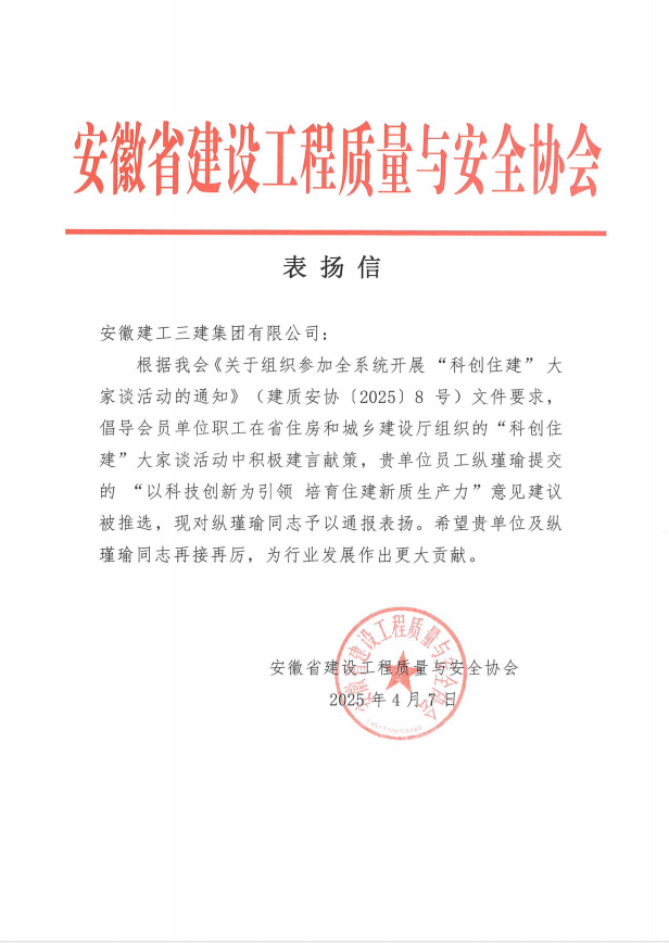 近日,安徽建工三建集團有限公司職工黃波、縱瑾瑜因在安徽省建設工程質量與安全協(xié)會“科創(chuàng)住建”大家談活動中提交的《關于發(fā)展智能建造和推廣應用建筑機器人的建議》和《淺談“以科技創(chuàng)新為引領 培育住建新質生產力”》獲通報表揚。