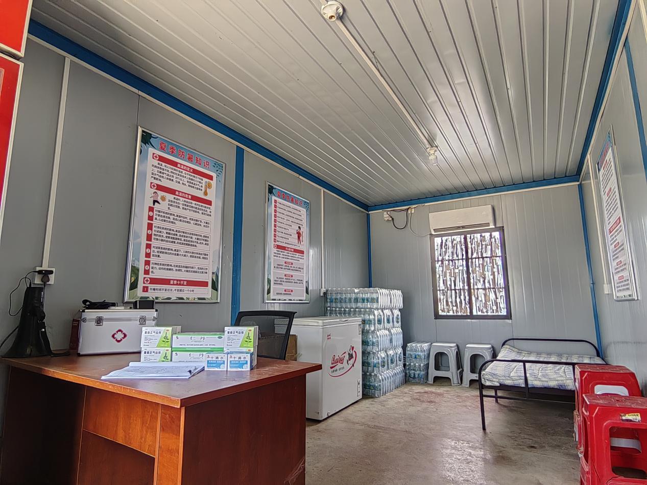 面對夏季高溫挑戰(zhàn),項(xiàng)目部堅持“以人為本、科技賦能、預(yù)防為主”的原則,制定“1+N”高溫專項(xiàng)施工方案,讓工人安心施工。在作業(yè)時間上,根據(jù)氣溫動態(tài)調(diào)整:37℃以下實(shí)行 “早出工、晚收工、中午休”的兩班倒模式;37℃以上則采取“白天培訓(xùn)、夜間施工”的方式,避開10:00-16:00的高溫時段。同時,防暑保障實(shí)現(xiàn)全覆蓋,現(xiàn)場設(shè)立配備空調(diào)、飲水機(jī)和急救箱的醫(yī)務(wù)室,每日供應(yīng)綠豆湯、冰鎮(zhèn)鹽汽水等飲品,并發(fā)放藿香正氣水、風(fēng)油精及大冰塊等防暑物資,切實(shí)保障作業(yè)人員健康安全。