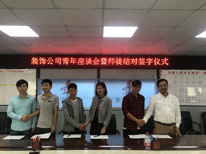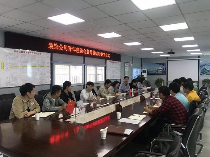為了調動裝飾公司青年職工的工作熱情和積極性,切實幫助青年職工解決工作和生活中的實際問題,10月12日下午,裝飾公司團支部在創新館項目部會議室召開以“溝通交流,相互學習,共同進步”為主題的青年職工交流會,并開展“師徒結對”活動。公司經理萬和生、黨支部書記高莉、副經理王皖、孫一甲及所有青年員工參加了交流會。