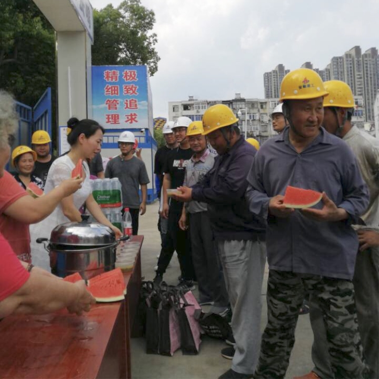 近期連日高溫炎熱,驕陽似火,酷暑難耐。安徽三建十公司蜀山區動力三村改造項目一線施工人員依然堅守在各自崗位。“你為我筑高樓大廈,我為你送綠豆甜瓜”。三建人揮汗奮戰的精神,感動了當地社區百姓。2019年7月25日下午三時,七里塘社區黨委副書記孫妹娟組織號召社區8名志愿者集中前往動力三村改造項目的施工現場開展“送清涼”活動,安徽三建十公司支部書記吳明寬、安全科長張玉保、項目經理李其云等人員參加活動。