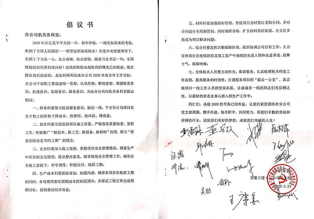 面對疫情的影響,十一公司堅定信心決定,咬定目標不放松,鼓干勁,見行動。3月24日,十一公司黨支部在分公司范圍內發起倡議書,要求全體職工要迅速統一思想,認清形勢,立足本職崗位,及時有效的完成自己的工作,為了順利完成分公司2020年全年工作目標努力拼搏。