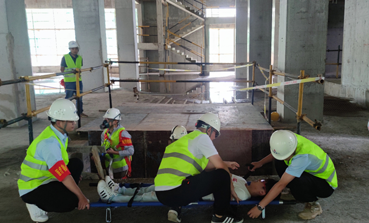 這次演練,重點模擬施工現場集水井清淤作業時,發生了作業人員中毒窒息事故。演練分通訊聯絡組、搶救搶險組、警戒疏散組、醫療救護組、后勤保障組等五組,演練人員演練了作業前的安全準備事項,以及氣體檢測儀、安全設備和器材的使用、防毒面具的佩戴方法、現場作業人員自救、醫療救護、現場警戒疏散等作業步驟和事故情況上報程序。經過半個小時緊張有序的演練,“傷員”得到有效救治并及時送醫,事故得到有效處置。