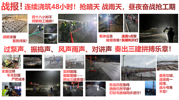 連續暴雨天氣剛過,為順利通過驗收,在兩臺拖泵同時接管,瓦工作業人員不足的情況下,區域施工長安排好地泵管排布、接管工作后,帶隊進行基坑抽排水,在管理人員和瓦工班組通力合作下于晚上八點半順利開泵,夜里十一點突然下起暴雨,為確保澆筑質量,管理人員夜間排班積極參與抽排水工作;因長時間暴雨,墊起的鋼板路面打滑,造成一輛滿載20方砼的泵車下陷,臨時聯系多名挖機司機,直至凌晨2點才將泵車順利拖出并將鋼板路面重新修整鋪設,但一個多小時的停泵造成兩條拖泵管線堵泵,突發情況下,暴雨中項目部全體青年職工集體應急、摧艱克難,凌晨5點雙泵再次順利開打。
