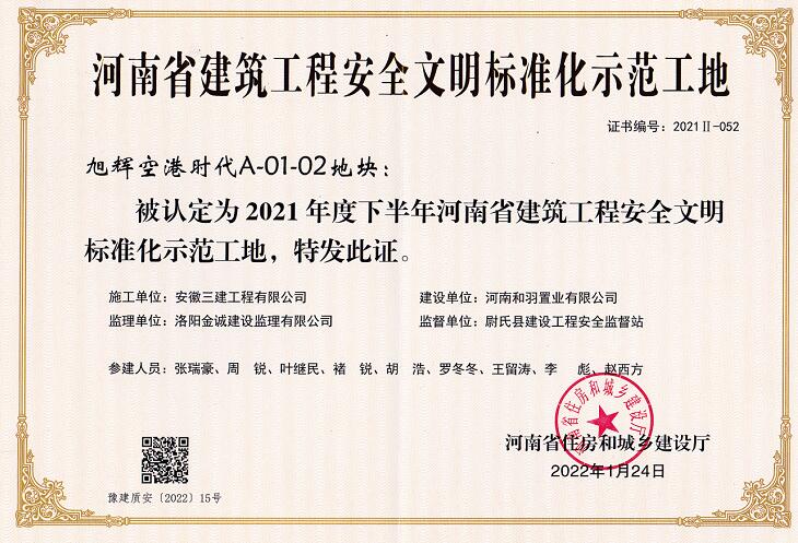旭輝空港時代項目獲評河南省“建筑工程安全文明標準化示范工地”稱號