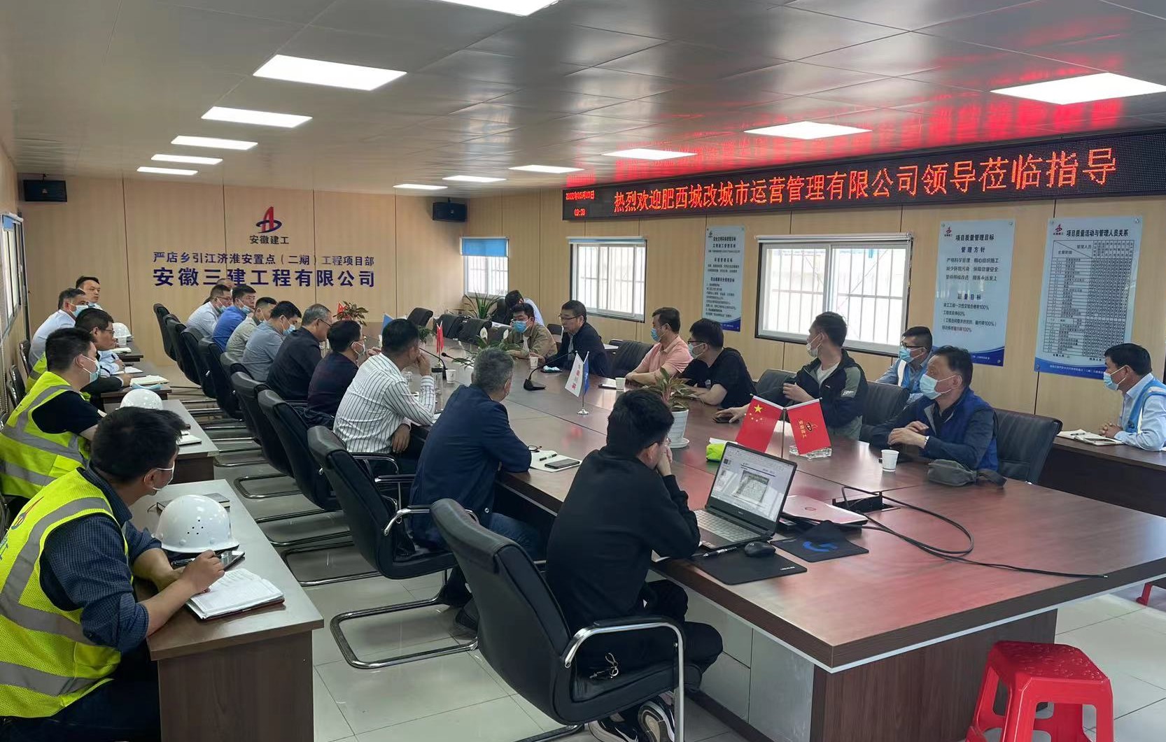 5月3日上午,在嚴店鄉引江濟淮安置點項目(二期)工程項目部召開了建設單位、監理單位、施工單位三方的協調部署會議,建設單位肥西城改城市運營管理有限公司董事長陳峰等相關負責人,公司黨委委員、副總經理張斌,九公司書記、經理陸軍等人參加會議。