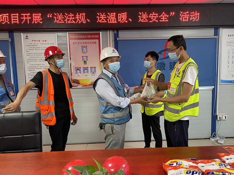 今年6月是第21個全國“安全生產月”,以“遵守安全生產法、當好第一責任人”為主題。按照《廬陽區重點中心2022年“安全生產月”和“安全生產廬陽行”》活動方案統一部署要求,6月2日下午,正值端午來臨之際,八公司五里片區項目黨支部組織項目黨員在一線班組職工中開展“送法規、送溫暖、送安全”活動,項目黨員帶領大家觀看了習近平總書記關于安全生產重要論述《生命重于泰山》專題紀錄片及近期發生的安全事故相關視頻,同時給大家發放《民法典與生活同行》普法宣傳冊,高溫防曬服、洗衣粉、粽子、咸鴨蛋和節日祝福。將安全生產與聯系群眾、服務職工相結合,極大地提高了廣大一線班組職工的安全意識,在職工中廣受好評。
