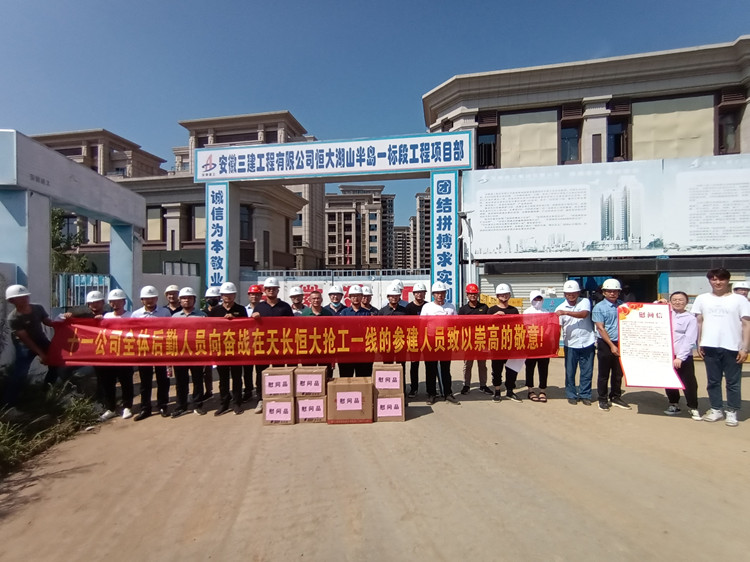 時值八月,正是最炎熱艱苦的季節,卻也是項目生產的黃金時期。8月5日上午,十一公司全體后勤人員前往天長恒大湖山半島項目開展慰問活動,向始終奮戰在搶工一線的參建人員送上一封聯名手寫的慰問信和慰問品,對他們表示衷心的感謝并致以崇高的敬意。