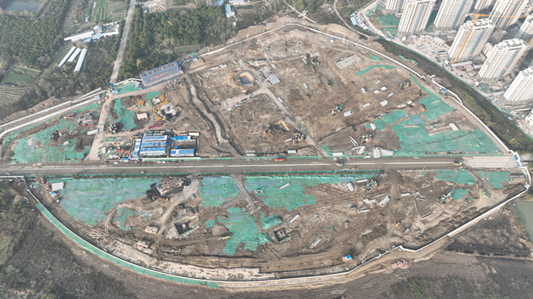 生產方面,現場科學謀劃,因現狀道路蘭渡路位于項目紅線內,將項目用地分為南北兩塊區域,137路公交車通行路線仍途經蘭渡路,對項目整體進度造成了極大影響。項目召開專題研討會,決定兵分兩路,一方面積極與大建辦、交管部門、公交集團協調溝通,盡快完成蘭渡路道改封閉事宜;另一方面,考慮施工現場不具備大面施工條件,項目謀劃永臨結合作業,充分利用現有場地條件,將室外永久圍墻及室外永久道路提前謀劃施工,在前期取得了顯著成效。在關鎮村155畝場地移交后,項目整體具備大面施工條件,在一天之內完成關鎮區域所有清表工作。