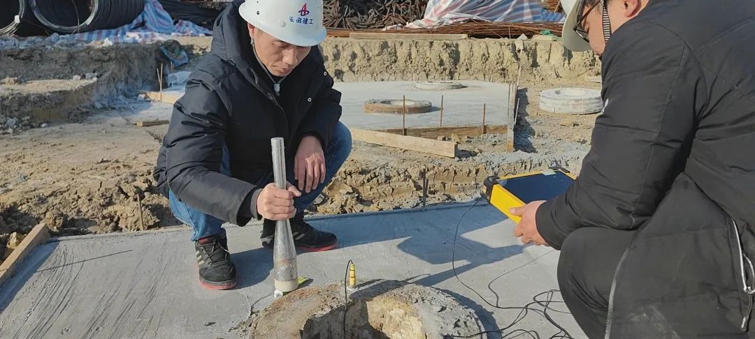 基礎公司郭磊在項目現場配合做樁基檢測。