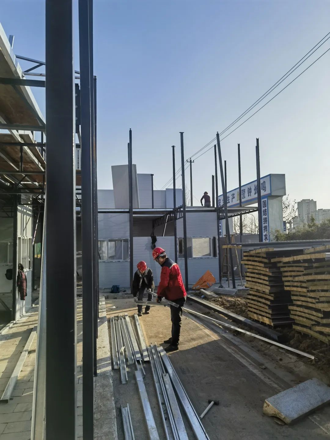 1月29日,三公司合肥職業技術學院匯心湖校區人才周轉房、教師公租房和留學生公寓建設項目,項目工人進場搭設辦公室活動房。