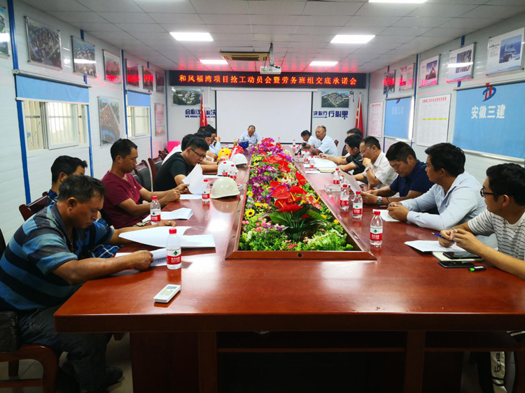 安徽三建海口海南之心新埠島和風福灣項目建筑面積8萬平方,造價2.2億,合同工期36個月,2019年6月份開始施工,原計劃2020年3月份全面封頂。在接到業主方提前封頂的要求后,分公司派專人到現場蹲點協調工作。10月20日下午,一公司副經理王慶成主持召開項目進度推進會,在會上啟動了勞動競賽活動。會上將生產任務進行分解,與各勞務班組簽訂工期責任狀,組織項目管理人員開展搶工誓師大會。項目部提前安排增加機械設備、人力、物力和技術等生產要素的投入,明確采取18小時倒班作業、多個作業面同時施工的搶工方式,保障不間斷作業。會議吹響了搶工“集結號”,當天就在原來380余人的基礎上120多人火速進駐現場。