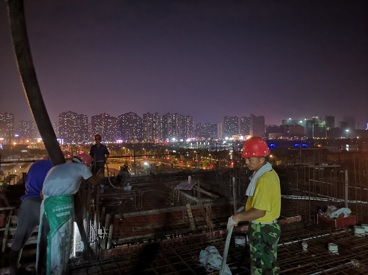 為避免日間高溫作業(yè),六公司亳州三巽公園里項目合理調(diào)整作業(yè)時間,組織工人夜間施工,圖為8月4日夜間項目澆筑混凝土